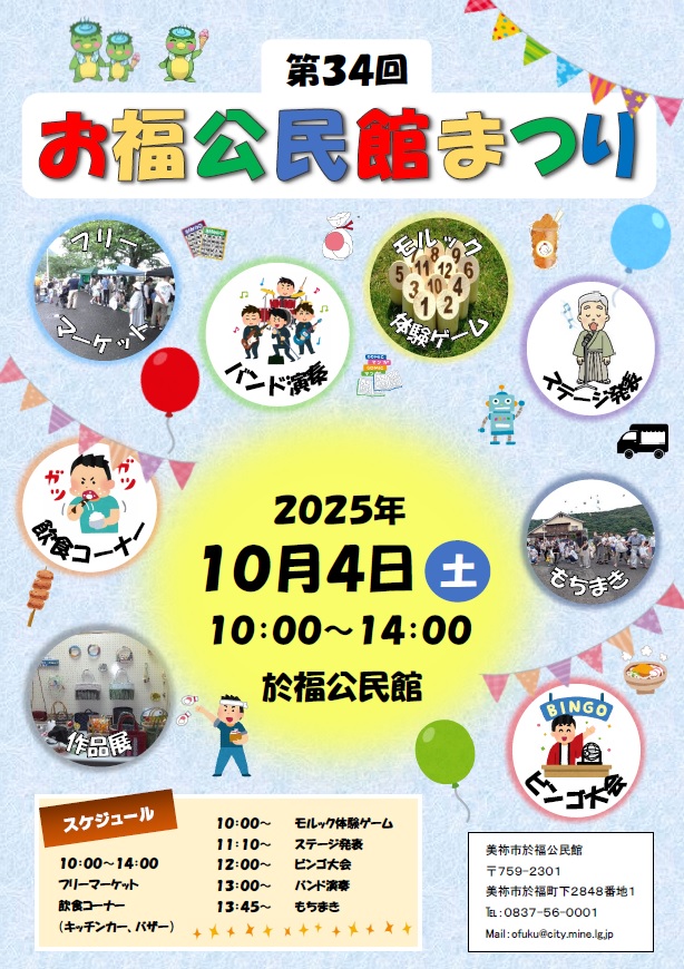 於福 イベント情報 メニュー 公民館の利用について お福公民館だより この記事に関するお問い合わせ先 於福公民館〒759-2302美祢市於福町下2848-1電話番号:0837-56-0001ファックス:0837-56-0044