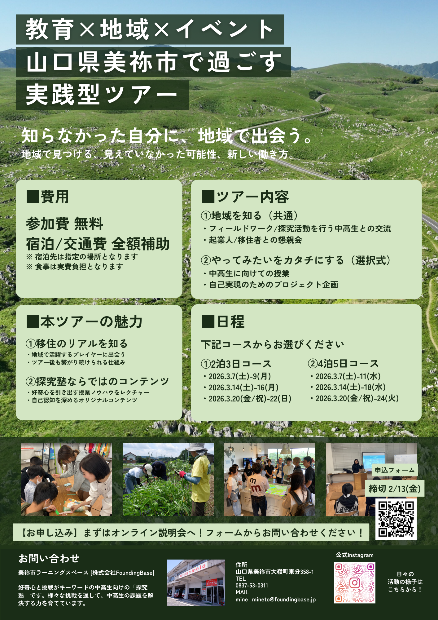 ”地域”=美祢という選択肢を知っていただくべく、3月に「実践型ツアー」を実施する運びとなりました!